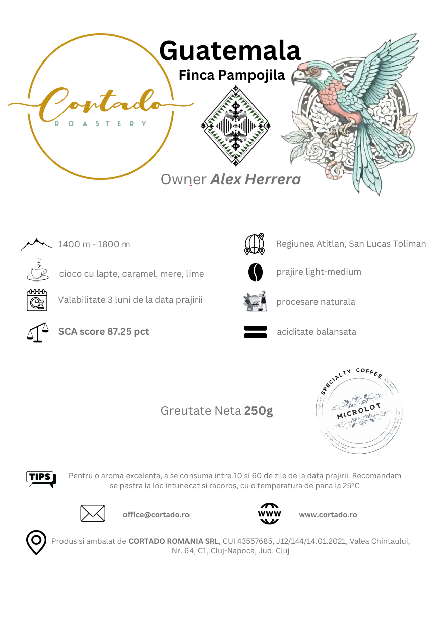 Alex Herrera avea o pasiune pentru cafea inca de cand era copil. Familia lui si-a dedicat peste 100 de ani cresterii si cultivarii cafelei in diferite regiuni alea Guatemalei. Lotul de fata este cultivat la ferma Pampojila, regiunea Atitlan in apropierea vulcanului cu aceeasi denumire la o altitudine cuprinsa intre 1400m si 1800m. Regasim o aroma fructata, cremoasa si balansata data de procesarea naturala a acestei cafele. Ceasca denota nuante caramelizate si note ce te duc cu gandul la mere verzi, lime si fructe exotice. Varietatile diverse regasite sunt culese intre lunile decembrie si martie si insumeaza un scor de cupping de 87,25 pc.